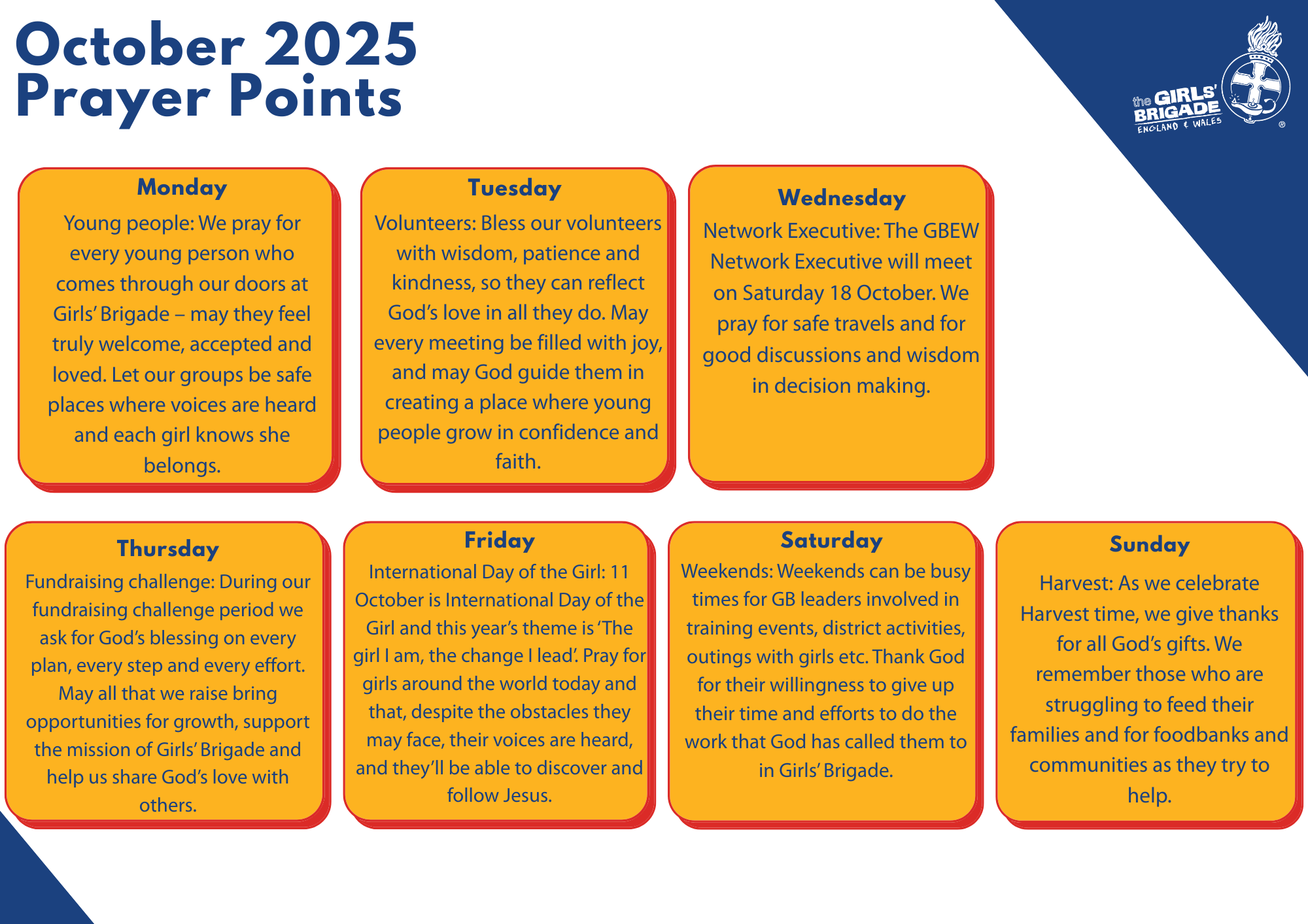 Young people: We pray for every young person who comes through our doors at Girls’ Brigade – may they feel truly welcome, accepted and loved. Let our groups be safe places where voices are heard and each girl knows she belongs.