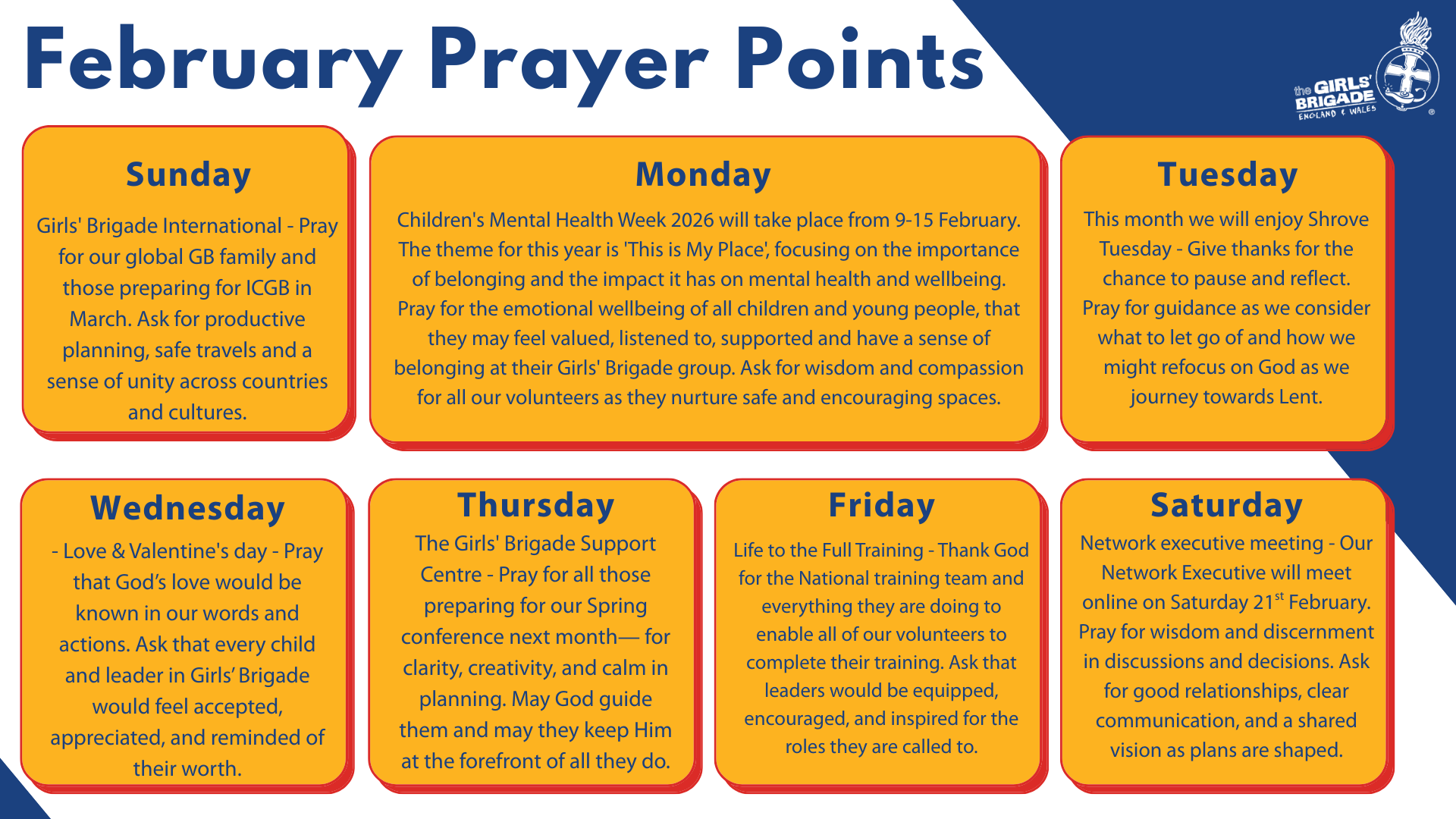 Monday – Each morning let us thank the Lord for a fresh start to the week, another day to bring others to know and love the Lord through the fun we have at Girls’ Brigade.